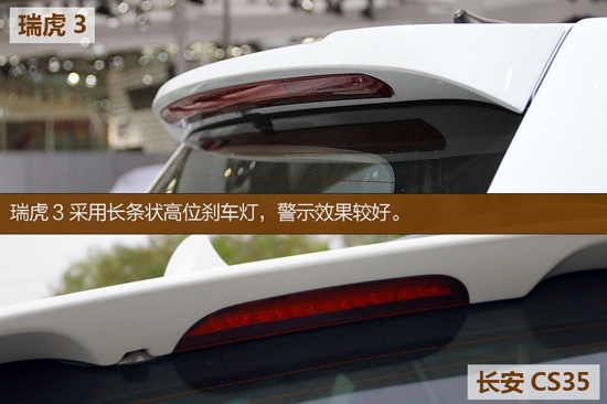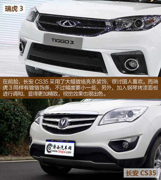 在前臉,長(zhǎng)安CS35采用了大幅鍍鉻亮條裝飾,很討國(guó)人喜歡。而瑞虎3同樣有鍍鉻飾條,不過(guò)幅度要小一些,同時(shí)還加入鋼琴烤漆面板進(jìn)行調(diào)和,個(gè)人感覺(jué)視覺(jué)效果要更加出色。