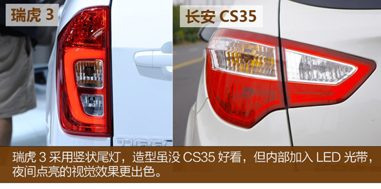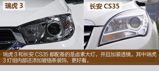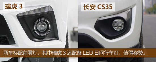瑞虎3和長(zhǎng)安CS35都配備鹵素大燈,在近光燈裝上透鏡。燈組都做了精細(xì)設(shè)計(jì),視覺(jué)效果不錯(cuò)。不過(guò)瑞虎3還配備LED日間行車燈,配置值得稱贊。