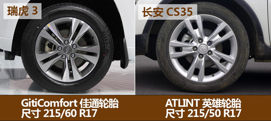 在小型SUV中能裝配17寸輪胎非常不錯(cuò),兩車都很厚道。只不過(guò)在輪胎品牌選擇上不同,奇瑞瑞虎3使用了佳通輪胎,而長(zhǎng)安CS35則為英雄輪胎。另外,雖然長(zhǎng)安CS35輪轂造型不差,但瑞虎3拋光輪轂造型顯得更加運(yùn)動(dòng)。