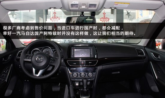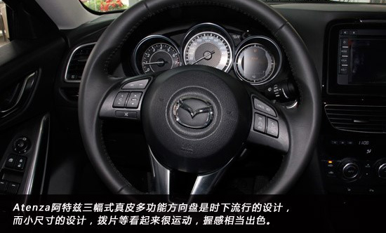 阿特茲的內(nèi)飾也與進(jìn)口版保持了一致,但相對于出色的外表,內(nèi)飾的設(shè)計顯得有些平庸了。造型動感的三輻式方向盤看上去相當(dāng)帶勁兒,握感很不錯。儀表盤采用了樸素的黑白配色,炮筒式的三圓形儀表營造出了強烈的運動感激發(fā)起人們的駕駛欲望。用料中規(guī)中矩,中控臺上表面以及門板扶手以上區(qū)域都采用了軟性材質(zhì),其它區(qū)域大多為硬塑料。