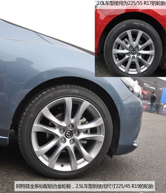 阿特茲全系標(biāo)配鋁合金輪轂,2.0L車型使用尺寸為225/55R17的輪胎,2.5L車型則使用尺寸225/45R19的輪胎。
