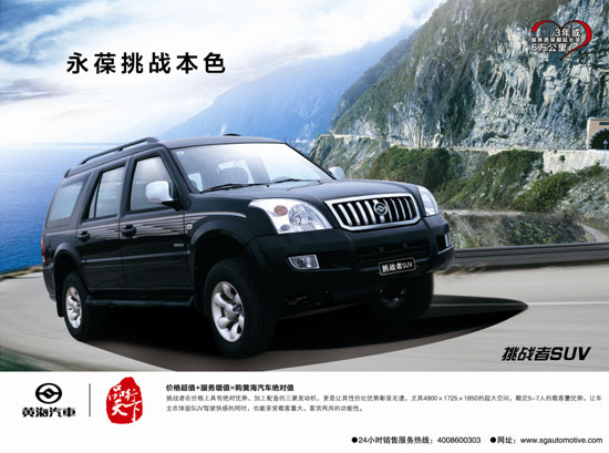 外觀霸氣,不失身份,內(nèi)部空間寬敞乘坐舒適,久坐不覺疲勞,7座設(shè)計(jì),其載客的功能性可與MPV媲美,同時(shí)若需要承載物品,二三排座椅可拆卸,在后部展露出大量空間,裝載2噸物品或長(zhǎng)1.83m,寬1.5m,高1.04m的貨物都沒問題。若家用:因其燃油經(jīng)濟(jì)性好,平時(shí)可以作為代步工具,節(jié)假日可全家游玩。讓低成本的黃海挑戰(zhàn)者不僅成為您創(chuàng)業(yè)的幫手,更可享受SUV的高性能駕車體驗(yàn)。
