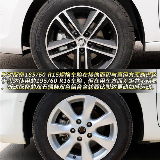 車胎方面,昕動配備185/60 R15規(guī)格車胎在接地面積與直徑方面略遜色于騏達(dá)使用的195/60 R16車胎,但在用車方面差距并不明顯。昕動配備的雙五輻條雙色鋁合金輪轂顯得動感時尚,騏達(dá)則使用了較為常見的七輻條輪轂。