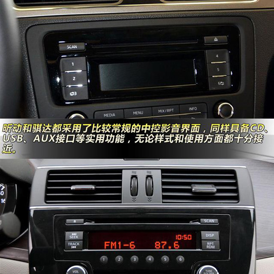 中控方面,昕動(dòng)和騏達(dá)都采用了比較常規(guī)的中控影音界面,同樣具備CD、USB、AUX接口等實(shí)用功能,無(wú)論樣式和使用方面都十分接近。