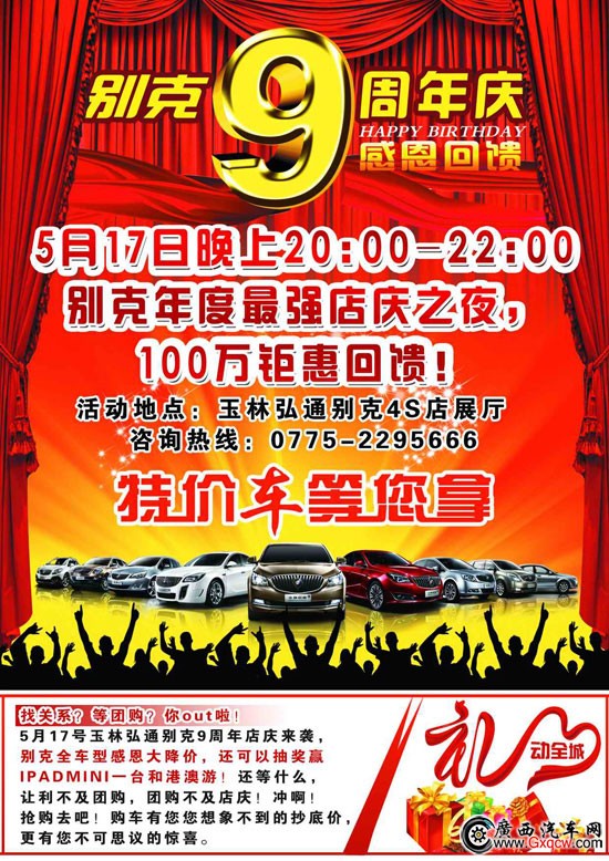 5月17號玉林弘通別克9周年店慶來襲,別克全車型感恩大降價,還可以抽獎贏IPADMINI一臺和港澳游!