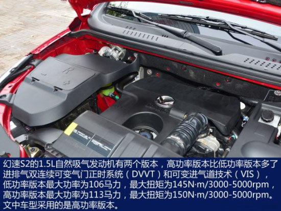 幻速S2采用了兩臺(tái)1.5L發(fā)動(dòng)機(jī),其中最低配置車(chē)型的發(fā)動(dòng)機(jī)是低功率版本,最大功率為106馬力,最大扭矩為145!っ;1.5L高功率發(fā)動(dòng)機(jī)最大功率113馬力,最大扭矩150!っ,是四款車(chē)型中動(dòng)力數(shù)據(jù)最強(qiáng)的。全系車(chē)型搭載的是一臺(tái)5速手動(dòng)變速箱。懸架結(jié)構(gòu)則是前麥弗遜式獨(dú)立懸架和后五連桿式半獨(dú)立懸架。