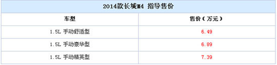 近日,從官方獲悉,2014款長城M4正式上市,此次上市新車共有3款,分別為舒適型、豪華型和精英型,其售價(jià)區(qū)間為6.49-7.39萬元。價(jià)格詳情見下表: