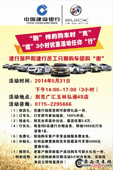 別克廣匯玉林弘通4S店為建設銀行玉林分行的戰(zhàn)略合作伙伴,一直以來有著良好的合作。針對建設銀行客戶和員工購車需求,別克廣匯玉林弘通4S店與建設銀行玉林分行將于2014年5月31日下午14:00-17:00將開展合作活動——建行客戶和員工分期購別克團購“惠”。此次活動,別克廣匯玉林弘通4S特別報批總部申請了一批“建設銀行客戶和員工優(yōu)惠購車活動”專屬優(yōu)惠政策的特惠車,僅限活動當天3小時,無論是購買別克汽車還是辦理建行分期購車都有特別的政策優(yōu)惠,機不可失失不再來,詳詢別克廣匯玉林弘通4S店400-922-0771 轉8188