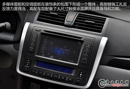 方正的多媒體面板和空調(diào)面板在裝飾條的包圍下形成一個整體,高配車型配備了大尺寸觸摸液晶屏并且具備導(dǎo)航功能,各按鍵做工扎實,反饋力度得當(dāng),給人留下不錯的音響,用戶可通過USB接口和SD卡播放自己喜歡的音樂。高配車型配備了自動空調(diào)系統(tǒng),強勁的冷風(fēng)為我們在炎熱的夏天提供了涼爽的車內(nèi)環(huán)境。