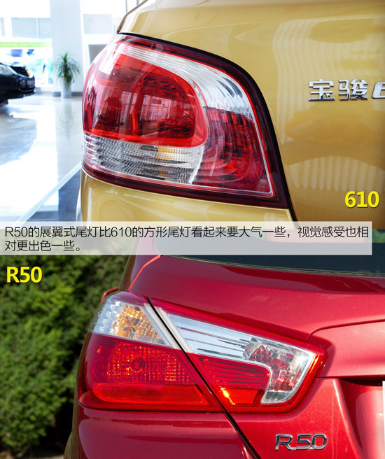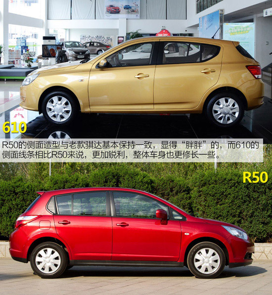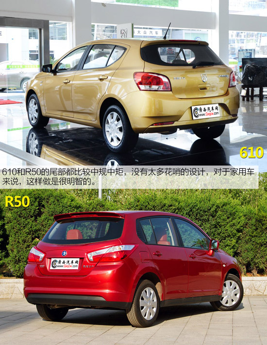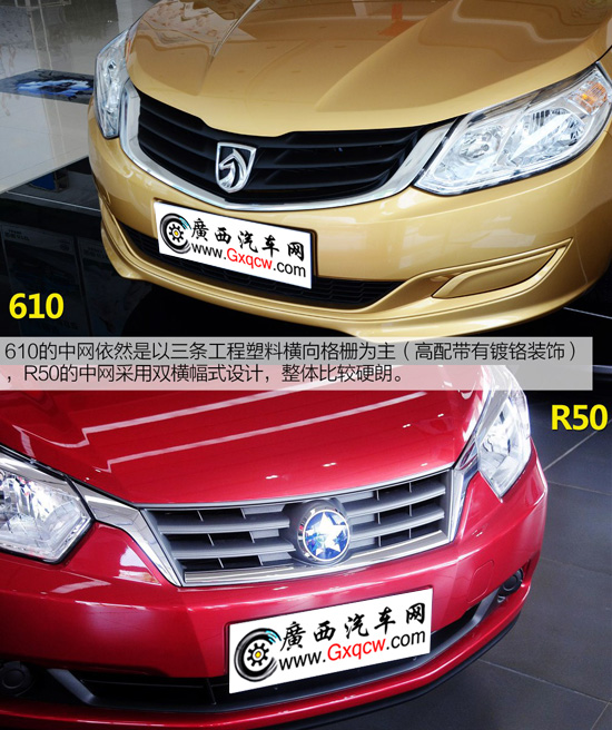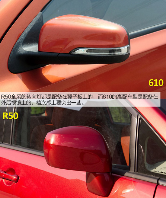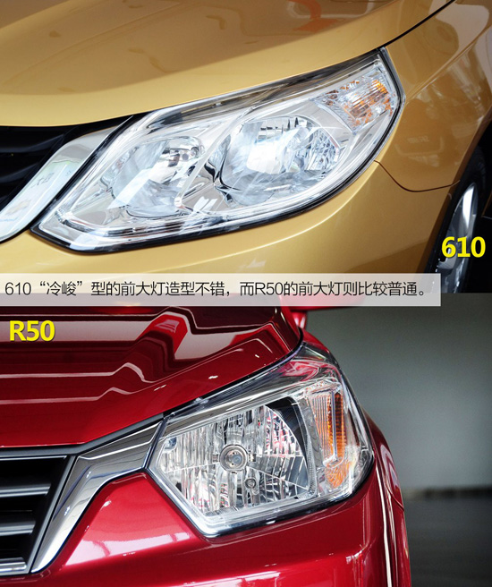 雖然610和R50的前臉都是延用各自三廂版的造型,但是610的部分細節(jié)和三廂版車型還是有所區(qū)別的,而R50和三廂版車型沒有任何區(qū)別。