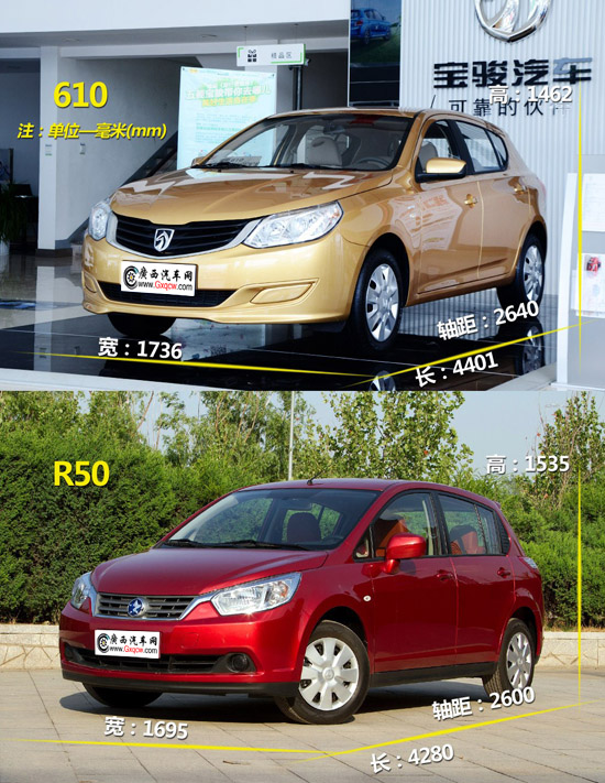 610的車身尺寸為4401/1736/1462/2640(mm),而R50的車身尺寸為4280/1695/1535/2600(mm),610除了在高度上遜色于R50外,其它數值均占有優(yōu)勢。