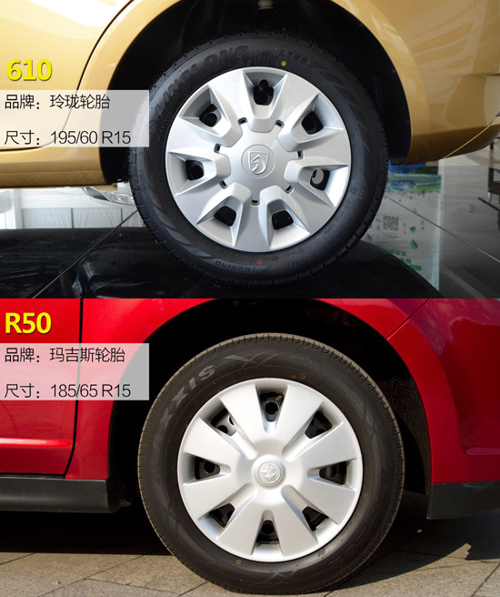 R50和610的低配車型同為鋼轂,高配車型鋁合金輪轂的造型也各有特點。輪胎尺寸方面,R50配備的尺寸為185/65 R15,而610配備的尺寸為195/60 R15,610略占優(yōu)勢。輪胎品牌上,R50為瑪吉斯,610為玲瓏,R50更為厚道。