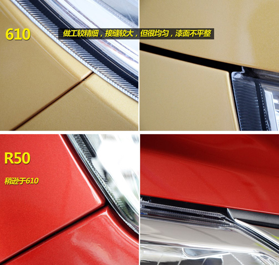 寶駿610的外部做工比較精細,接縫雖然較大,但很均勻,也沒有廢料、漆面不平整等明顯瑕疵。而R50的外部做工雖然也達到了這個價位的主流水平,但相比610來說,還是遜色了一些。