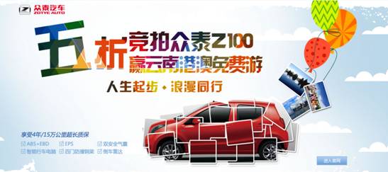 另外,眾泰Z100還火熱推出了5折競(jìng)拍眾泰Z100的優(yōu)惠活動(dòng),起拍價(jià)僅1.6萬(wàn)元,只要給出您的心理價(jià)位,便有機(jī)會(huì)以半價(jià)購(gòu)得愛(ài)車,同時(shí)在專題頁(yè)面實(shí)名注冊(cè)還還能參與行車記錄儀、車載吸塵器、腰靠坐墊等精美禮品的抽獎(jiǎng)。