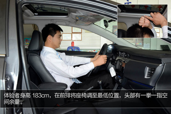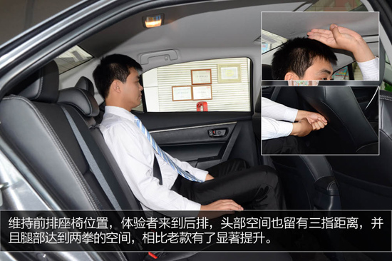 體驗者身高183cm,在前排將座椅調至最低位置,頭部有一拳一指空間余量。維持前排座椅位置,體驗者來到后排,頭部空間也留有三指距離,并且腿部達到兩拳的空間,相比老款有了顯著提升。