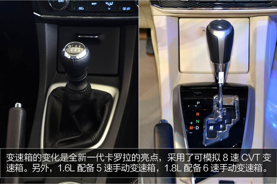 全新一代卡羅拉搭載了1.6L和1.8L兩款發(fā)動機,發(fā)動機通過細節(jié)優(yōu)化提升了工作效率和燃油經濟性。其中,1.8L發(fā)動機最大功率103kw/6400rpm,最大扭矩173Nm/4000rpm。1.6L發(fā)動機最大功率90kw/6000rpm,最大扭矩154Nm/5200rpm。變速箱的變化是全新一代卡羅拉的亮點,采用了可模擬8速CVT變速箱,并且同時配備手動擋車型。1.6L配備5速手動變速箱,而1.8L配備6速手動變速箱。
