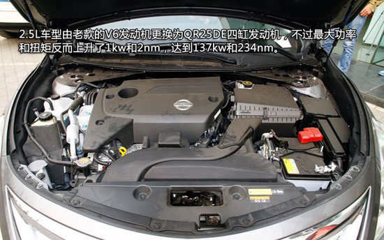 新一代天籟的動力系統(tǒng)在之前一直是被人提及最多的地方,之前主打的V6發(fā)動機(jī)已經(jīng)被全新的QR25DE四缸發(fā)動機(jī)所取代,從技術(shù)角度來說,全新的發(fā)動機(jī)不論從技術(shù)先進(jìn)性、動力參數(shù)、輕量化設(shè)計還是燃油經(jīng)濟(jì)性方面都要優(yōu)于之前的VQ25發(fā)動機(jī),QR25DE在進(jìn)排氣都配備了連續(xù)可變氣門正時技術(shù),配氣機(jī)構(gòu)更為先進(jìn);其最大功率和扭矩也不降反升,相比VQ25也分別提升了1Ps和2Nm;另外在發(fā)動機(jī)的重量和制造成本上,它也要優(yōu)于現(xiàn)在的VQ25;工信部給出的百公里綜合油耗僅為7.3L。