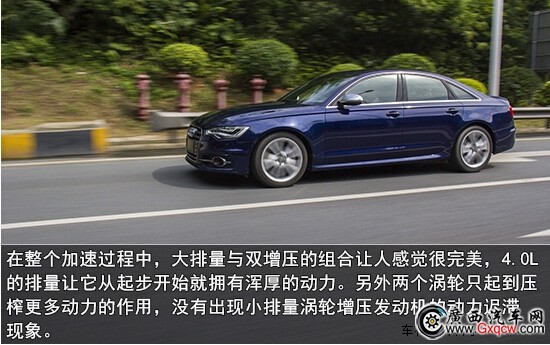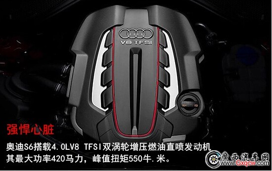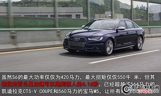 我們很有必要了解下這臺(tái)S6的動(dòng)力總成, 4.0L V8 TFSI雙渦輪增壓燃油直噴發(fā)動(dòng)機(jī)匹配7速S-tronic雙離合變速箱,在5500-6400 rpm/min時(shí)能輸出309KW(420馬力)最大功率,并且在1400-5200 rpm/min 的轉(zhuǎn)速區(qū)間內(nèi)都可以持續(xù)輸出550 n•m的峰值扭矩。官方數(shù)據(jù)百公里加速僅需4.6秒,而實(shí)際測試結(jié)果更讓人出乎意料,其百公里加速可以達(dá)到驚人的4.16秒。這樣的實(shí)力已經(jīng)超越了564馬力的凱迪拉克CTS-V COUPE和560馬力的寶馬M5,讓所有對(duì)手不敢輕視!S6具備這樣實(shí)力也跟具備彈射起步功能的七速雙離合變速箱和優(yōu)異的quattro四驅(qū)系統(tǒng)分不開。兩者結(jié)合,使得奧迪S6能以將近5000rpm的高轉(zhuǎn)速從靜止開始起跑,而且輪胎全然不會(huì)出現(xiàn)任何打滑,在這一點(diǎn)讓很多大排量的高性能車都難以望其項(xiàng)背。