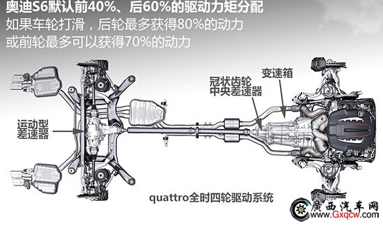 另外特別需要提一提奧迪賴以為榮的quattro四驅(qū)系統(tǒng),在默認(rèn)情況下這套系統(tǒng)采用的是前后4:6的動(dòng)力分配,而如果遇到車輪打滑后,其動(dòng)力輸出比可以在2:8和7:3這個(gè)范圍內(nèi)自動(dòng)調(diào)整。小齊發(fā)現(xiàn)這個(gè)系統(tǒng)能帶給駕駛著帶來信心和樂趣,雖說是臺(tái)大排量的性能車,但你不用過多分心于你的駕駛操作方式,因?yàn)檫@個(gè)quattro系統(tǒng)有非常好的包容性。