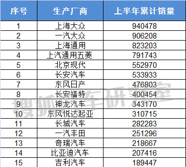 今年上半年,我國乘用車市場前十企業(yè)依次是上海大眾、一汽大眾、上海通用、上汽通用五菱、北京現(xiàn)代、長安汽車、東風日產(chǎn)、長安福特、神龍汽車和東風悅達起亞。