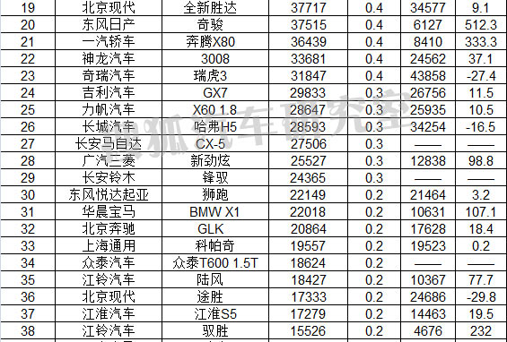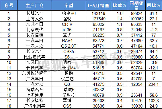 2014年上半年全國(guó)SUV累計(jì)銷量1,810,074輛,同比增長(zhǎng)35.9%,占狹義乘用車比重20.4%。盡管長(zhǎng)城汽車上半年銷量下滑明顯,但主要是受轎車銷量影響,SUV仍然保持上漲。哈弗H6以14.31萬(wàn)輛的上半年銷量登上SUV車型榜首,同比增幅為61.1%。有分析人士稱,“長(zhǎng)城汽車采取的戰(zhàn)略是先保SUV的產(chǎn)量!