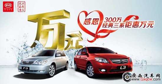 (廣西汽車網(wǎng) 訊)為慶祝比亞迪全系車型銷量即將突破300萬輛, 3系車型銷量超過160萬輛,比亞迪自即日起開展“感恩300萬 經(jīng)典3系鉅惠萬元”活動,以回饋廣大消費者。本次鉅惠幅度大、涵蓋車型廣,覆蓋L3、G3及經(jīng)典F3等多款車型,最高優(yōu)惠達萬元,產(chǎn)品性價比進一步提升。