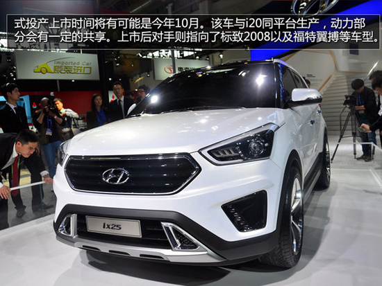北京現(xiàn)代全新小型—ix25,在本屆北京國際車展首發(fā)亮相。而正式投產(chǎn)上市時間將有可能是今年10月。該車與i20同平臺生產(chǎn),動力部分會有一定的共享。上市后對手則指向了標致2008以及福特翼搏等車型......