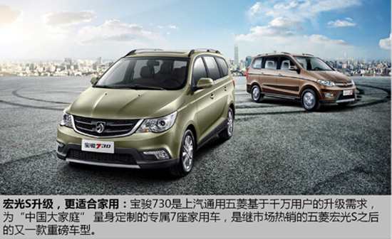 宏光S升級,更適合家用:寶駿730是上汽通用五菱基于千萬用戶的升級需求,為“中國大家庭” 量身定制的專屬7座家用車,是繼市場熱銷的五菱宏光S之后的又一款重磅車型。相比宏光S,寶駿730完全是一款舒適愜意、配置豐富的家庭用車,是一臺可以讓全家人在一起享受歡聚時光的幸福座駕。寶駿730基于上汽通用五菱全新自主研發(fā)的轎車化前置前驅(qū)平臺,具有超大空間、全方位安全保障、駕乘皆宜、超值配置四大越級性的產(chǎn)品特點。