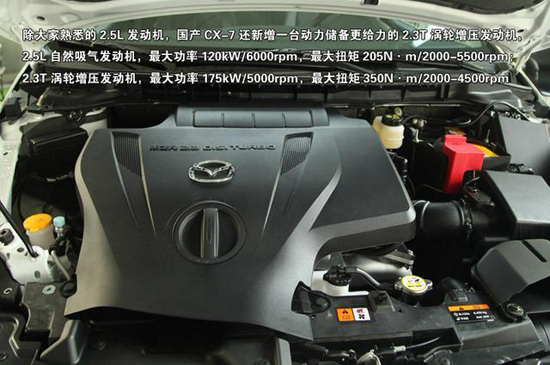 動力方面,國產(chǎn)馬自達CX-7將搭載2.3T發(fā)動機或者2.5L自然吸氣發(fā)動機可選,前者最大功率為238Ps(175kW),峰值扭矩為350N?m,傳動系統(tǒng)與之匹配的是5速手自一體變速箱;后者最大功率為163Ps,峰值扭矩為205N?m,傳動系統(tǒng)與之匹配的是6速手自一體變速箱。另外,新車將提供前驅(qū)版和四驅(qū)版車型供消費者選擇。