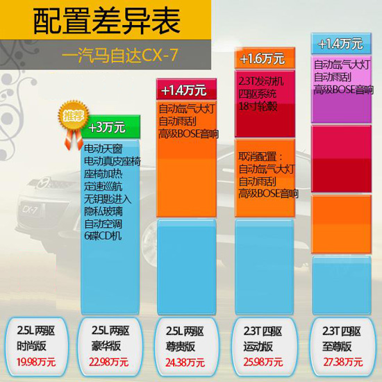 之后便是兩款2.3T車型,發(fā)動(dòng)機(jī)的動(dòng)力性有了本質(zhì)提升,而且增加了四驅(qū)系統(tǒng)。配置方面,2.3T智能四驅(qū)運(yùn)動(dòng)版相比2.5L豪華版升級(jí)了18寸輪轂,兩者差價(jià)3萬(wàn)元。暫且不說(shuō)性價(jià)比,我覺得CX-7完全沒有必要選擇2.3T四驅(qū)版,雖然動(dòng)力提升,但油耗亦增加不少,且四驅(qū)系統(tǒng)在日常使用中的實(shí)際作用并不高。