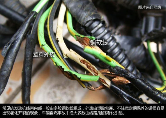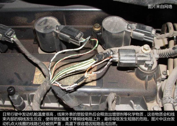 常見的發(fā)動機線束的內(nèi)部一般由多股銅軟線組成,外表由塑膠包裹。日常行駛中機艙溫度很高,線束外表的塑膠受熱后會釋放出增塑劑等化學物質(zhì),這些物質(zhì)會和線束內(nèi)部的銅線發(fā)生反應,導致塑膠強度下降,銅線電阻上升,最終使線束老化產(chǎn)生短路的危險。機艙內(nèi)的橡膠軟管則屬于不飽和高分子碳氫化合物,橡膠老化后也易發(fā)生氧化引起車輛自燃。