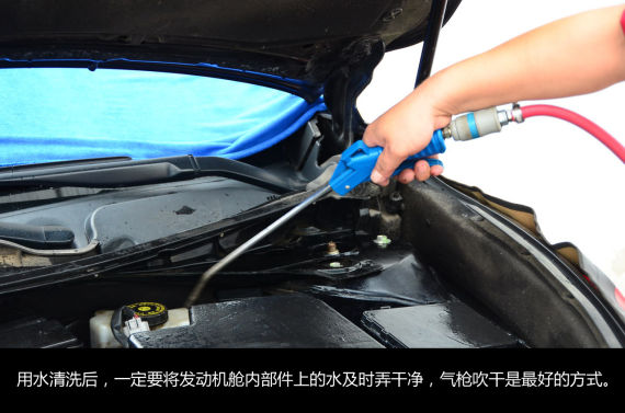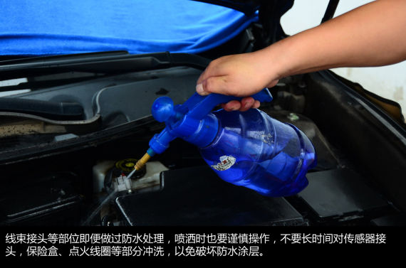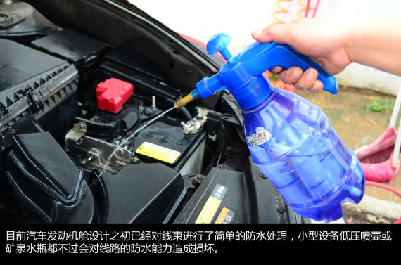 清洗劑瓦解油泥去除灰塵后,最終還會(huì)附著在機(jī)艙內(nèi)的各個(gè)零部件上及線路上,在它們風(fēng)干之前需要用清水將它們沖洗干凈。需要注意的目前汽車的發(fā)動(dòng)機(jī)艙設(shè)計(jì)之初已經(jīng)對(duì)線束進(jìn)行了簡(jiǎn)單的防水處理,小型設(shè)備低壓噴壺或礦泉水瓶都不過會(huì)對(duì)線路的防水能力造成損壞。高壓水槍的副作用則可想而知了,因此清洗時(shí)切勿使用高壓水槍。
