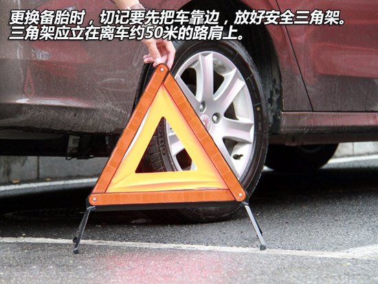 1.在實際道路上更換備胎時,必須將車輛靠邊停放(盡量避免坡道),并在距離車輛50-100米處立好安全三角架。