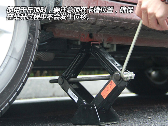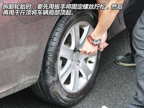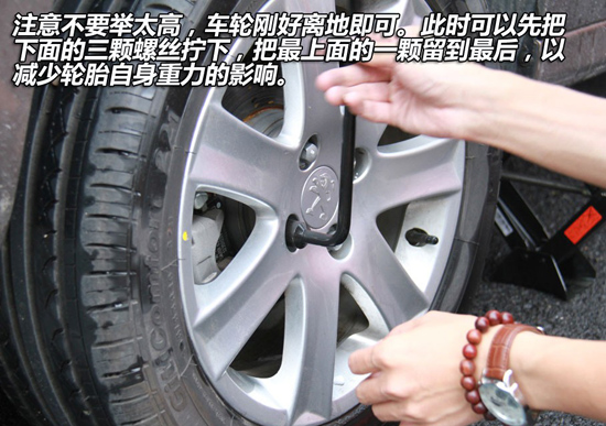 3.先在地上擰松螺絲,再用千斤頂舉起車輛(不要舉太高)。