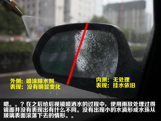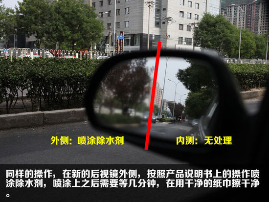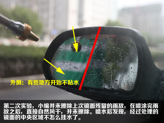 實(shí)驗(yàn)結(jié)果:也許因?yàn)槭庆o態(tài)測(cè)試的原因,效果并不是特別明顯,但可以看到經(jīng)過雨敵處理的外側(cè)后視鏡表面中央?yún)^(qū)域不怎么掛水,而且水滴基本都是凝固成一個(gè)個(gè)的小水珠。如果是在行駛過程中,風(fēng)一吹效果會(huì)更好。
