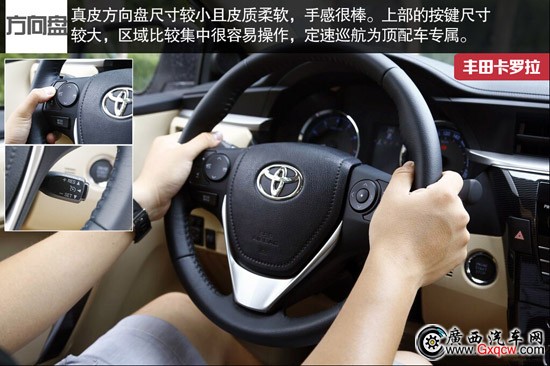 卡羅拉采用了尺寸較小的方向盤(pán),手感很厚實(shí),加上較軟的皮質(zhì),握起來(lái)甚至很讓人上癮。上部的按鍵豐富且尺寸較大,位置也比較集中,操作起來(lái)很方便。軒逸的真皮多功能方向盤(pán)手感同樣很不錯(cuò),按鍵位于左側(cè),控制起來(lái)很方便,總之卡羅拉和軒逸在方向盤(pán)握感方面真的很難評(píng)出誰(shuí)好誰(shuí)壞,二者均很出色。