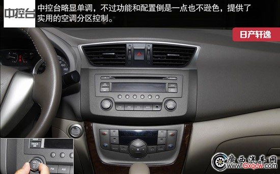 卡羅拉的中控部分比較運(yùn)動(dòng),帶有觸摸液晶屏,控制面板分區(qū)清晰,且旋鈕的阻尼感很好,我們借到的這臺(tái)中配版軒逸可以選裝中控液晶屏,但是這臺(tái)車(chē)并沒(méi)有裝配,這也使得它的中控臺(tái)略顯單調(diào),不過(guò)功能和配置倒是一點(diǎn)也不遜色。