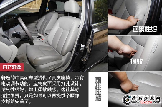 兩款車(chē)都采用了電動(dòng)調(diào)節(jié)的皮質(zhì)座椅,相比之下卡羅拉的皮面要稍硬一些,而軒逸則在透氣性以及包裹性方面更勝一籌,不過(guò)值得一提的是,卡羅拉配備了腰部支撐調(diào)節(jié),同樣可以提升一定的乘坐舒適性。