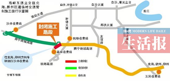 3.機(jī)場方向車輛需經(jīng)高嶺收費站前往北海、柳州方向的車輛可繞行那洪大道、那歷路、南站大道進(jìn)沙井收費站前往目的地。