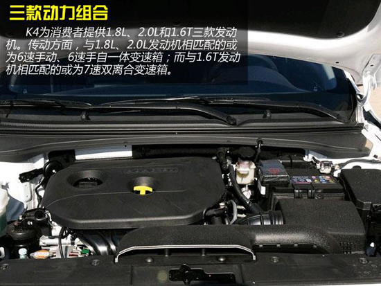 K4為消費(fèi)者提供1.8L、2.0L和1.6T三款發(fā)動(dòng)機(jī)。傳動(dòng)方面,與1.8L、2.0L發(fā)動(dòng)機(jī)相匹配的或?yàn)?速手動(dòng)、6速手自一體變速箱;而與1.6T發(fā)動(dòng)機(jī)相匹配的或?yàn)?速雙離合變速箱。