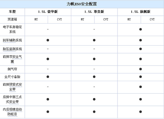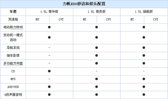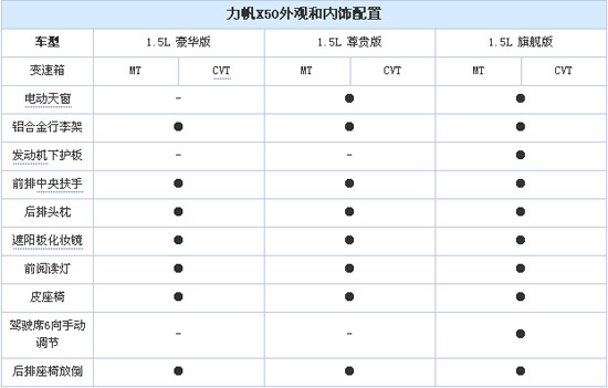 從外觀和內(nèi)飾配置來(lái)看,力帆X50除最低配的豪華版之外,其余車型均配備了電動(dòng)天窗和發(fā)動(dòng)機(jī)下護(hù)板,此外該車還標(biāo)配皮座椅、前排中央扶手等配置。