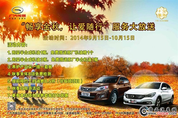 廣汽傳祺南寧迅利店《暢享金秋,讓愛隨行》活動(dòng)正式啟動(dòng),為您“疲勞”的愛車送上最溫暖呵護(hù)。