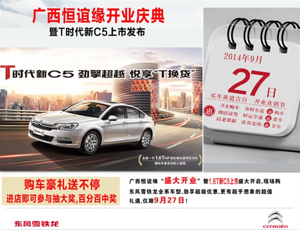 9月27日上午10點,東風(fēng)雪鐵龍廣西恒誼緣旗艦店開業(yè)慶典暨T時代新C5上市發(fā)布將在南寧市昆侖大道89號,金橋客運(yùn)站往賓陽方向300米處廣西恒誼緣雪鐵龍4S旗艦店內(nèi)隆重舉行!典禮將邀請雪鐵龍區(qū)域經(jīng)理以及華南大區(qū)主任及東風(fēng)雪鐵龍公司相關(guān)領(lǐng)導(dǎo)出席參加,屆時將會送出多重大禮: