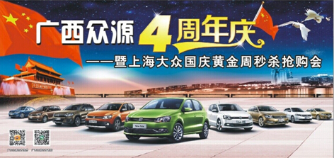 10月將迎來廣西眾源4周年店慶,洽逢國慶65周年華誕、上海大眾30周年慶, “三慶”同樂,為感謝廣大客戶對廣西眾源的支持與厚愛, 9月27日-10月7日,我們特別推出上海大眾“十.一“秒殺搶購會,徹底大“放價”,天天秒殺價!全城鉅惠,買汽車,到廣西眾源對比之后再決定!