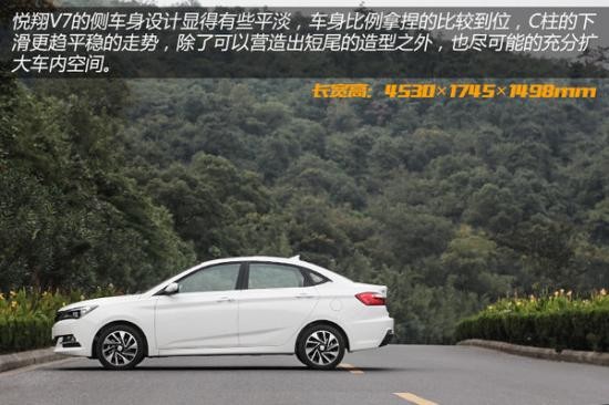 悅翔V7的側(cè)車身設(shè)計顯得有些平淡,車身比例拿捏的比較到位,C柱的下滑更趨平穩(wěn)的走勢,除了可以營造出短尾的造型之外,也盡可能的充分?jǐn)U大車內(nèi)空間。車身尺寸從數(shù)據(jù)上不難看出相比同級車型并不占優(yōu),不過這也造就了它精致而緊湊的外形。