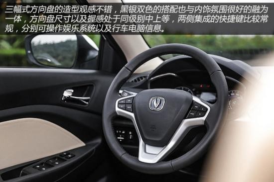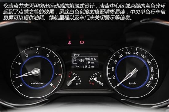 三幅式方向盤的造型觀感不錯,黑銀雙色的搭配也與內(nèi)飾氛圍很好的融為一體,方向盤尺寸以及握感處于同級別中上等,兩側(cè)集成的快捷鍵比較常規(guī),分別可操作娛 樂系統(tǒng)以及行車電腦信息。儀表盤并未采用突出運動感的炮筒式設(shè)計,表盤中心區(qū)域點綴的藍色光環(huán)起到了點睛之筆的效果,黑底白色刻度的搭配清晰易讀,中央單 色行車信息屏可以提供油耗、續(xù)航里程以及車門未關(guān)閉警示等信息。
