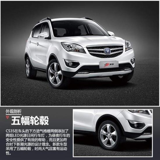 車身外觀方面,新款CS35繼續(xù)沿用了老款大氣且時尚耐看的設計風格,在車頭部分細節(jié)做了調整。新車依舊采用雙鍍鉻裝飾的前進氣格柵,搭配帶透鏡的晶鉆石式大燈。在車頭的下方進氣格柵兩側添加了兩組LED光源日間行車燈,為晝夜行車的安全性提供了有效的幫助,而且更加符合時下新潮光源的設計理念。新款車型采用了五幅輪轂,時尚大氣且富有運動性。