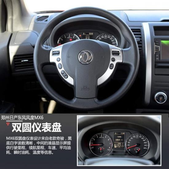 內(nèi)飾方面,在MX6上依然可以看到老款奇駿的影子,只是在中央顯示屏和儀表盤做出了小幅調(diào)整。中控臺(tái)采用搪塑工藝,手感上佳,各功能區(qū)劃分明確,6.2英寸液晶顯示屏可以供導(dǎo)航、藍(lán)牙、倒車影像等功能。MX6還配備了自動(dòng)空調(diào)功能,使用起來較為方便。三幅式多功能方向盤移植于老款奇駿,只是中間換成了東風(fēng)雙飛燕l(xiāng)ogo,多功能按鍵可實(shí)現(xiàn)音量調(diào)節(jié)、定速巡航等功能。