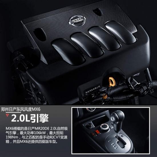 鄭州日產(chǎn)東風(fēng)風(fēng)度MX6在動(dòng)力上采用的是與日產(chǎn)天籟相同的MR20DE 2.0L自然吸氣發(fā)動(dòng)機(jī),陪陪手動(dòng)和CVT變速箱,最大功率為106kW,最大扭矩則為198Nm,MX6的動(dòng)力表現(xiàn)中規(guī)中矩,在同級(jí)別車型中并無明顯優(yōu)勢(shì),希望在燃油經(jīng)濟(jì)性方面可以讓消費(fèi)者滿意,進(jìn)一步提升自身競(jìng)爭(zhēng)力。