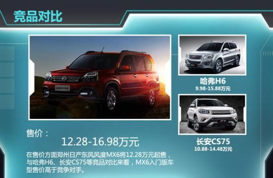 鄭州日產(chǎn)東風(fēng)風(fēng)度MX6上市后,將會(huì)在緊湊型SUV市場(chǎng)中與哈弗H6、長(zhǎng)安CS75等車型展開正面交鋒,通過其12.28萬元的起售價(jià)格來看,MX6并無明顯優(yōu)勢(shì),不過通過吸收日產(chǎn)多年造車經(jīng)驗(yàn)并與老款奇駿同平臺(tái)打造等有利條件,MX6有望在國(guó)產(chǎn)緊湊型SUV市場(chǎng)擁有較好的表現(xiàn)。